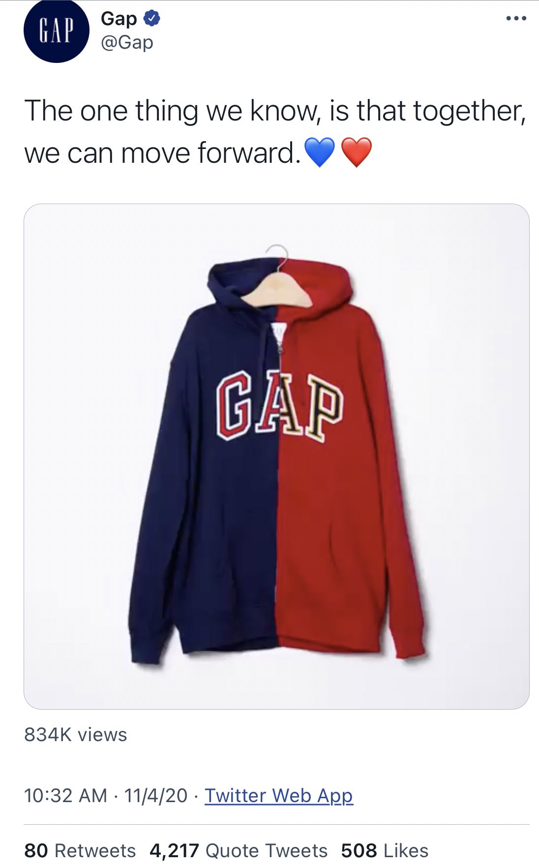 The image depicts a Gap hoodie, one side blue, the other side red, joined at the zipper, with the caption, “The one thing we know is that together, we can move forward.”